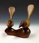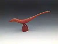 Throughout his career, Milan used a wide range of woods including domestic hardwoods such as maple, walnut, and black cherry, as well as exotic imported species such as zebrawood, padouk, cocobolo, bubinga, lapacho, and rosewood.[30] Buckridge items made from imported woods commanded higher prices.[31] He periodically capitalized on grain patterns, intensive figure, and contrasting heartwood and sapwood colors as design elements in his works.[32][33] Silver components occasionally were added to functional wooden works, and he made a few cheese boards with flat ceramic inserts as cutting surfaces.[34] He was frugal with wood and used scraps to make saleable functional and art objects. Cutouts from large bowl forms, for example, were used to make fish, birds, and abstract sculptures, and the remaining pieces were used to make small salt bowls and spoons.[35]