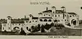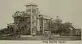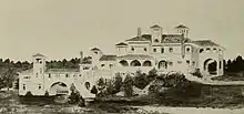 Joseph Dillaway Sawyer, biographer of George Washington and an early subdivision developer, purchased a 78-acre farm from the widow Sabina Bowen in 1886 in Old Greenwich, Connecticut, with plans to build and divide the parcel into plots as summer homes for New Yorkers.[34] When Sawyer bought the farm, he selected one site which he envisioned as the location of a "Moorish castle".[35] Though he wrote a book about his development of the houses on other sites and designed their plans himself,[36] Sawyer hired Holman[34] to design his Italianate style mansion, which stretches 228 feet across a 9.72-acre lot and contains 9,342 interior square feet.[37] Spanning an entire city block,[35] the house featured a stuccoed exterior, arch-windowed turrets and copper-flashed, tiled roofing.[38] The interior sported multiple stairways to the towers of the four-story dwelling. In addition to a 25 x 25 ft mahogany-paneled library and a dining room of equal size, the house had a billiard room, servants quarters and multiple bedrooms, as well as fireplaces on each floor. The house was constructed to follow the contours of the hill upon which it was built and provided a panoramic view of the Long Island Sound. The house was scheduled for demolition due to its deteriorated state in 2014.[39]