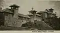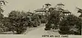 Each of the cottages on the property were designed by Holman and the girls for each sorority selected the plans under which their clubhouse was designed. The clubhouses were not lived in but were used for social functions. The first bungalow was built for the Alpha Epsilon Pi Sorority formed in 1895.[21] It followed the East Coast bungalow style, utilizing oak trees which had been felled to clear the site.[21] The second bungalow built was for the Chi Omicron Pi ("Chiopi") Sorority, which had been formed in 1894, but whose clubhouse was not built until after the completion of Alpha.[22] Built in 1896,[19] it was also in the bungalow style but featured upturned edges giving it an oriental look.[22] The third clubhouse built was for the Zeta Eta Theta Sorority in 1898. It was built in the style of a Swiss chalet and relocated from its original site when the ballroom was built in 1927.[23] The Kappa Delta Phi Sorority was formed in 1899 and selected a smocked Dutch Windmill style from Holman's plan book.[24] The fifth bungalow was built in 1903 for the Phi Delta Psi Sorority in the Colonial Revival style, featuring both Georgian and Neoclassical elements. It was initially intended to emulate an English gatehouse, but the road underneath was never completed.[25] The sixth bungalow was built for the Theta Sigma Rho Sorority, which formed in 1903. The sorority sisters chose the Spanish Mission Revival style for their clubhouse. It was the first example of Mission style in the Washington, D.C. metropolitan area and its interior featured authentic Native American rugs and furnishings from New Mexico.[26] Pi Beta Nu Sorority formed in 1903, but their clubhouse was not built until 1904. The girls chose a circular stuccoed Castle, based on a British design complete with a drawbridge.[27] The last of the clubhouses to be completed was perhaps the most distinctive. It was built for the Chi Psi Upsilon Sorority in 1904 and is in the style of a Japanese pagoda. Its interior featured a Buddha statue as well as many authentic details.[28]
