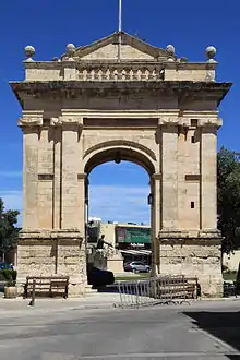 Rohan sought to win the respect of the people of the island of Malta, and he became a popular Grand Master. On 21 June 1777, he elevated the village of Żebbuġ to the status of city, naming it Città Rohan. The coat of arms of Żebbuġ contains the arms of the House of Rohan, in honour of the Grand Master.[3] The De Rohan Arch commemorating this event was constructed in 1798.[4]
