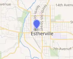 Emmet County was created in 1851, but because it lacked settlers, no county government was established until 1858 and a vote was taken on February 7, 1859.[1] A group of three commissioners chose Estherville to be the county seat. A Fort Dodge, Iowa contractor received a contract to build a schoolhouse and a courthouse in 1859. The schoolhouse was completed and the construction on the courthouse was under when the county realized it could not pay the contractor with the land it promised because the surveyor general would not accept the surveys done in Emmet County and release the land.[2] The contractor established land agencies in the eastern United States that issued worthless land deeds. When the landowners arrived in the county they found out they had to homestead the land in order to receive the land from the government. The completed school building was moved to a different location and it was used as the courthouse until 1876 when it was destroyed by fire.