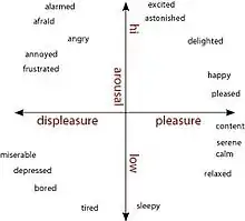 Emotional granularity is a very specific and complex concept, but can be seen in similar concepts such as emotional differentiation and emotional intelligence. Emotional granularity itself is a fairly new term, developed by Lisa Feldman Barrett. By using the valence/arousal circumplex as a guide, Barrett conducts studies showing that individuals exhibit a certain level of valence focus and arousal focus, which contribute to their overall emotional granularity. It has been found that an individual has a certain valence focus, meaning the extent to which they can differentiate between positive and negative emotions, and an arousal focus, which is the extent to which one can discriminate between high and low arousal emotions.[2]