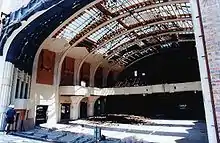The deep profile corrugated fibrous cement main roof is supported on single span steel trusses which have a segmentally curved bottom chord and have been manufactured from riveted angle iron sections. The bottom chord of the trusses are clad in fibrous plaster that sweeps down the walls and over iron supporting stanchions. The ceiling which follows the curve is lined with Craftex, a proprietary fibrous board. This material has been used extensively on the walls and ceilings inside the auditorium for its sound absorption qualities. Perforated fibrous plaster vents are located down the centre of the auditorium ceiling that connect to five ridge vents.[2]