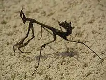 Empusidae is a family of plant-mimicking mantises[1] (see Mantodea), consisting of 10 genera, holding almost 30 species.[2] Unlike many other mantis families, the Empusidae are a monophyletic lineage.[1][3][4] Empusidae mantises are ambush predators,[4] with mouthparts adapted to feeding on other insects and small animals.[3] The majority of Empusidae species are distributed throughout Africa, but they are also found in Southeast Asia and in the southern parts of Europe.[5]