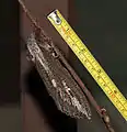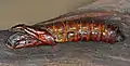 The adult moth is large (it has a wingspan of about 16 cm), with a fine mottled grey pattern and rusty red base on its wings. The moth has degenerate mouthparts, and is unable to feed itself, relying solely on nourishment obtained during its larval phase.[2]