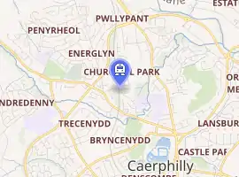 Energlyn & Churchill Park railway station (Welsh: Eneu'r-glyn a Pharc Churchill) is a railway station in Caerphilly, Wales, on the Rhymney Line. The northbound platform is in the Energlyn suburb of Caerphilly, whilst the southbound one is in Churchill Park. The station is between Llanbradach and Aber.