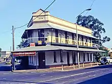 The hotel, which has a hipped corrugated iron roof concealed by a string coursed parapet, is built to the property boundary of an acute angled block, giving it a V-shaped plan, truncated at the corner. The corner is emphasised with the addition of a pedimental element, projecting above the parapet. A relief moulding of the date "1870" appears on the parapet on this corner.[1]