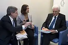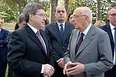However, the growing criticism of the slow pace of Italian economic reform left the government increasingly isolated.[20] On 13 February 2014, following tensions with his left-wing rival Matteo Renzi, Letta announced he would resign as Prime Minister the following day. The Democratic Party voted heavily in favour of backing Renzi's call for a new government, a "new phase" and a "radical programme" of reform. Minutes after the PD national committee backed the Renzi's proposal by 136 votes to 16, with two abstentions, Palazzo Chigi – the official residence of the prime minister – said Letta would be going to the Quirinale on Friday to tender his resignation to Giorgio Napolitano. In a speech earlier, Renzi had paid tribute to Letta's government, saying the meeting was not intended to put it "on trial". But, without directly proposing himself as the next premier, he said the eurozone's third-largest economy urgently needed "a new phase" and "radical programme" to push through reforms. The motion made clear "the necessity and urgency of opening a new phase with a new executive". Speaking to the party leadership, Renzi had said Italy was "at a crossroads" and faced either holding fresh elections or a new government without a return to the polls.[21] On 14 February 2014 Giorgio Napolitano accepted Letta's resignation from the office of Prime Minister and Giovannini was succeeded by Giuliano Poletti as new Minister of Labour and Social Policies.[20][22]