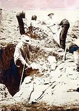 Since his university days de Cerralbo has developed keen interest in culture and history; his first encounter with archaeology took place in the Madrid site of Ciempozuelos in 1895.[118] He started to collect objects retrieved from various demolitions and organized archeological excavations himself: the first ones were those in upper Jalón valley, commenced in 1908.[119] His key success was discovery of the Celtiberian site of Arcóbriga, listed as Arcobrigensis in the Roman sources and sought by generations from the 16th century; based on multi-faceted analysis[120] Cerralbo correctly narrowed the search area and discovered the site, where excavations were to continue for tens of years to come.[121] In 1909, following numerous notes about odd findings, he commenced excavations in Torralba del Moral and Ambrona, continued until 1916, at that time considered the most ancient human settling discovered so far in Europe.[122] El hombre fossil by Hugo Obermaier (1916), a paleontological reference book for generations, was partially based on de Cerralbo's findings. Remained a promoter, sponsor, director and assessor on many other sites.[123]