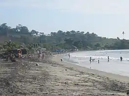 Mompiche village at the south of the bay can be reached by a 6 kilometres (3.7 mi) potholed road from the Via del Pacifico (Ecuador Highway 15). Its accessibility has led to small hotels and hostels being built, primarily for low-income surfers.[4] The broad Mompiche Beach is almost 6 kilometres (3.7 mi) long and has fine white/gold sand. It extends north from the small fishing village of Mompiche to the river estuary at Muisne. It is a popular place for surfing, and ecotourism is also popular. The Mache Chundul National Reserve, which contains mangroves and dry forests, is near to the beach.[5]