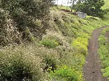 A. riparia was first introduced to New Zealand as an ornamental plant in the 1930s. It quickly spread and became naturalised on the North Island.[5] It proved particularly invasive in open areas, on slopes, and on the edges of forests and wetlands. In areas where the plant was dominant, sediment built up more quickly and slopes were less stable than with native ground cover. The species often overtook and smothered flora less than a meter tall.[9] It posed a threat to the ecosystem on the whole, but In 1996, it was reported as an active threat to two native plants in particular: Veronica bishopiana and Hebe acutiflora.[10]