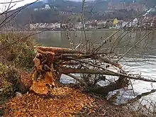 In downtown Martinez, California, a male and female beaver arrived in Alhambra Creek in 2006.[99] The Martinez beavers built a dam 30 feet wide and at one time 6 feet high, and chewed through half the willows and other creekside landscaping the city planted as part of its $9.7 million 1999 flood-improvement project. When the City Council wanted to remove the beavers because of fears of flooding, local residents organized to protect them, forming an organization called "Worth a Dam".[100] Resolution included installation of a flow device through the beaver dam so that the pond's water level could not become excessive. Now protected, the beavers have transformed Alhambra Creek from a trickle into multiple dams and beaver ponds, which in turn, led to the return of steelhead trout and river otter in 2008, and mink in 2009.[101][102] The Martinez beavers probably originated from the Sacramento-San Joaquin River Delta, which once held the largest concentration of beavers in North America.[103]