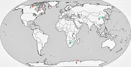 | Acasta Gneisses | 4.03 Ga to 3.96 Ga | Slave Craton in Northwest Canada | Highly deformed TTG, with interleaving amphibolite, ultramafic rocks and pink granites | |