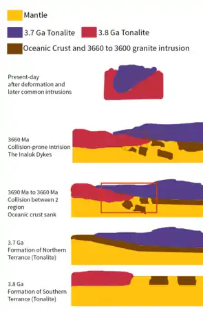 Docking of the old and new block happened between the earliest 3690 Ma and the latest 3660 Ma.[2] As 3690 Ma was the age yielded from the youngest tonalite,[11] which is only native in Northern terrane. It indicates a high possibility at 3690 Ma of a far distance between the northern region and the southern region. And 3660 Ma is the age yielded from the ultramafic-to-dioritic Inaluk dykes,[11] which is a common intrusion in both terrane. Therefore, It is a strong evidence showing that these two plate had been collided to each other.