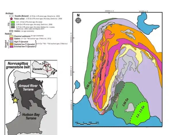 The Nuvvuagituq Belt is bounded by eoarchean tonalites, trondhjemites and granodiorite aged around 3660 Ma, and further surrounded by younger approximately 2750 Ma tonalities.[34] Surrounding tonalites, trondhjemites and granodiorites (TTGs) are the product of partial melting of Hadean Mafic lithologies, which was similar to the Ujaraaluk unit. The remelt products of "Hadean Ujaraaluk" and the exposed, eoarhcean Ujarraluk unit share similar geochemical composition i.e. isotopic ratio between 142-Neodymiun to 144-Neodymium.[28] TTG-Felsic crusts formed in multiple episodes. By U-Pb zircon geochronology, the fourfold episodic TTGs were yielded 3.76 Ga, 3.66 Ga, 3.5–3.4 Ga and 3.35 Ga.[34] The surrounding TTG are suggested to be an indicator for paleo subduction systems.
