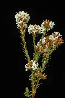 The woolly heath mostly flowers from late winter to early summer. When in bloom, small white flowers forming in dense terminal clusters along the upper 10 cm or more of branches. With 13–30 bracts and lanceolate sepals about 4.5–7.5mm long both brown with a papery texture. The corolla is white and tubular to narrowly bell shaped 4.5-8mm long, equal to or slightly longer than the calyx, with tiny white hairs internally, the petal lobes 2.7–4 mm long, obtuse; anthers enclosed within the corolla tube; ovary also finely hairy, nectary scales narrowly triangular, style slightly thicker and pubescent in middle third, 5.5–7.5 mm long.[4] Its fruit is a papery capsule. When the lower capsule on the stem has opened the capsules higher on the stem are ready to collect. Germination of the seed takes place under dark conditions and using heat shock combined with smoke and water treatments.[5]