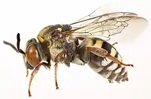 Epeolus cruciger is a small bee in which the females have a reddish scutellum and tend to have entirely red legs. The fifth sternite is straight when viewed from the side and from below it is noticeably wider than it is long. The abdomen is nearly completely reddish. The males have a dark scutellum (scutellum dark) usually have a reddish pygidium.[3] The abdomen is black with large, paired whitish patches of flattened hair[4] on each side. They are 6-8mm in length.[5]