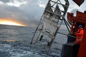 An epibenthic sled (or epibenthos sled/sledge) is an instrument designed to collect benthic and benthopelagic faunas from the deep sea. The sled is made from a steel frame consisting of two skids and stabilizing planes to keep it from sinking too deep into the mud. Attached to the frame is a 1 mm mesh net to collect the samples.[1][2] The sled is towed along the seafloor at the sediment water interface. The device has a mechanically operated door that is closed when the sled is mid water and opens when it reaches the seafloor. When the fauna is collected, the door closes again to preserve the sample on the long trek back through the water column. The door prevents washing of the sample and loss of organisms through turbulence generated as the net is lifted out.[3] The epibenthic sled can also be used with external sensors and cameras.