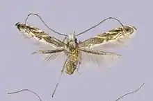 The wingspan is 7.5–11 mm. The forewings are brown with a narrow white band on the dorsum from the base to 2/3 of the entire length. There are three pairs of narrow white bands beginning at the costal and dorsal margin near 1/2 to 3/4 length of the wing and extending obliquely toward the wing apex, terminating before reaching mid-width of the wing. There is a narrow silver band with metallic reflection extending from the costa to the dorsum at 5/6 length and the distal 1/6 is orange-brown with a black dot centrally, franked by a short white band near the dorsum. The distal end is fringed with a narrow white band. The hindwings are brown.