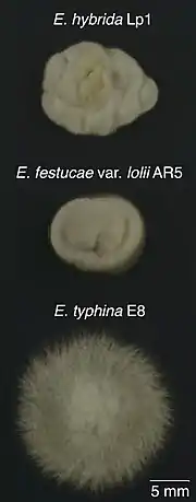 Epichloë hybrida is a systemic, asexual and seed-transmissible endophyte of perennial ryegrass (Lolium perenne L.) within the genus Epichloë.[1] An interspecies allopolyploid of two haploid parent species Epichloë typhina and Epichloë festucae var. lolii (previously classified as Neotyphodium lolii), E. hybrida was first identified in 1989,[2] recognized as an interspecific hybrid in 1994,[3] but only formally named in 2017.[1] Previously this species was often informally called Epichloë typhina x Epichloë festucae var. lolii, or referenced by the identifier of its most well-studied strain, Lp1.[1] Epichloë hybrida is a symbiont of perennial ryegrass where its presence is almost entirely asymptomatic.[4] The species has been commercialized for the benefits of its anti-insect compounds in a pasture setting,[5] although it is now more commonly used as an experimental model system for studying interspecific hybridization in fungi.[6][1]
