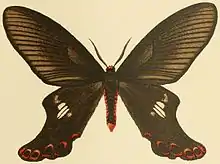 The wingspan is 85–100 mm. The wings are deep black with red, white and shining metallic-blue markings, mimicking butterflies of the genus Atrophaneura. It is a day-flying moth.[2]