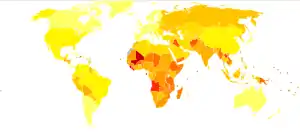 According to the Global Hunger Index, South Asia (also known as the Indian Subcontinent) has the highest child malnutrition rate of world's regions.[12] India, a largely vegetarian country and second largest country in the world by population, contributes most number in malnutrition in the region. The 2006 report mentioned that "the low status of women in South Asian countries and their lack of nutritional knowledge are important determinants of high prevalence of underweight children in the region" and was concerned that South Asia has "inadequate feeding and caring practices for young children".[13]