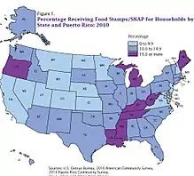 Although the United States Department of Agriculture reported in 2012 that an estimated 85.5 percent of households in the country are food secure, millions of people in America struggle with the threat of hunger or experience hunger on a daily basis.[20] The USDA defines food security as the economic condition of a household wherein which there is reliable access to a sufficient amount of food so all household members can lead a healthy productive life.[21] Hunger is most commonly related to poverty since a lack of food helps perpetuate the cycle of poverty. Most obviously, when individuals live in poverty they lack the financial resources to purchase food or pay for unexpected events, such as a medical emergency. When such emergencies arise, families are forced to cut back on food spending so they can meet the financial demands of the unexpected emergency.[22] There is not one single cause of hunger but rather a complex interconnected web of various factors. Some of the most vulnerable populations to hunger are the elderly, children, people from a low socioeconomic status, and minority groups; however, hunger's impact is not limited to these individuals.