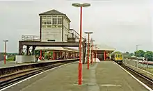 For many years the southern ends of the platforms had a large signal box above them, dating from 1929. It was not listed, and despite extensive roof repairs it was demolished in March 1992.