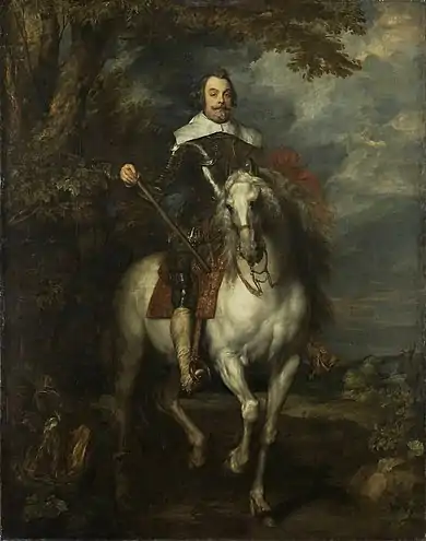It shows Francisco de Moncada, who for one year was governor of the Spanish Netherlands.[4] It was one of a pair of portraits of da Moncada simultaneously commissioned in 1634, just after his return to his native Flanders after a stay in London - the other is in the seated Portrait of Francisco da Moncada (Kunsthistorisches Museum).[5] He probably copied the pose from a drawing of a horse-rider seen face on by his former master Peter Paul Rubens,[6] whilst Charles Coypel in turn produced a copy of the work.[7][8]