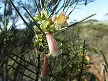 The flowers are borne singly or in groups of up to 4 in leaf axils on hairy stalks 3–10.5 mm (0.1–0.4 in) long. There are 5 hairy, spoon-shaped to lance-shaped sepals which are mostly 7–18 mm (0.3–0.7 in) long and which are cream-coloured or brown. The petals are mostly 20–30 mm (0.8–1 in) long and are joined at their lower end to form a tube. The petal tube is cream-coloured with a pink tinge, pink, red or (rarely) maroon. The tube and its lobes are glabrous apart from the margins of the lobes, and the inside of the tube which is hairy. The 4 stamens extend slightly beyond the end of the petal tube. Flowering occurs from winter to early summer[3] and the fruits which follow are oval to cylindrical in shape and 4–7 mm (0.2–0.3 in) long.[2][3][4][5]