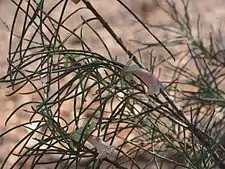 - Eremophila oppositifolia subsp. angustifolia (S.Moore) Chinnock [11] has leaves that are cylindrical in shape, not flat, firm, erect and 1–3 mm (0.04–0.1 in) wide;[2]