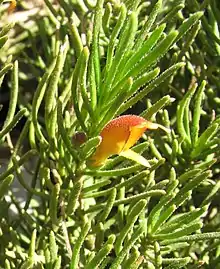 Eremophila subteretifolia is classified as "Threatened Flora (Declared Rare Flora — Extant)" by the Department of Environment and Conservation (Western Australia).[5] It is listed as "Endangered" (EN) under the Australian Government Environment Protection and Biodiversity Conservation Act 1999 (EPBC Act)[6] and an interim recovery plan has been prepared.[7] In 2002, the total wild population was estimated to be 119 mature plants occurring in six locations to the south of Lake King. Threats to the species include increasing salinity, waterlogging, road maintenance, vehicle damage and grazing by rabbits (Oryctolagus cuniculus).[7]