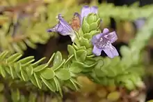 Eremophila ternifolia, commonly known as Wongan eremophila[2] is a flowering plant in the figwort family, Scrophulariaceae and is endemic to Western Australia. It is a low, many-branched, shrub with short, pointed leaves and small lilac-coloured or mauve flowers.