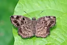 Eretis melania, the dusky elf, dusky skipper or common elf, is a butterfly in the family Hesperiidae. It is found in Guinea, Sierra Leone, Liberia, Ivory Coast, Ghana, Togo, Nigeria, Cameroon, Gabon, Angola, the Democratic Republic of the Congo, southern Sudan, Uganda, Kenya, Tanzania, Malawi, northern Zambia, Mozambique, eastern Zimbabwe and northern Namibia.[2] The habitat consists of woodland, Guinea savanna, forest margins and forests.