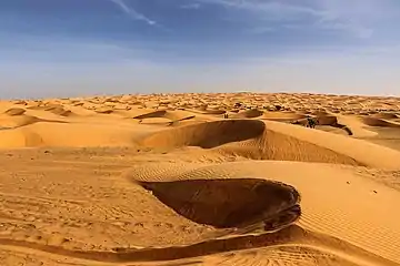 In addition to endless dunes, Erg Amatlich gathers a great variety of Saharan landscapes such as canyons, cliffs, cultivable basins and palm groves like Azoueïga, located on the west side of the erg.[2]