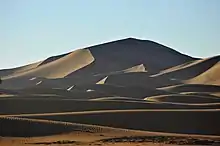 Erg Chigaga (or Erg Chegaga, Berber: ⴻⵔⴳ ⵛⴳⵉⴳⴰ, Arabic: عرق شقاق or Edaya el-Hamra, Arabic: الضاية الحمراء) is the largest and still untouched of the major ergs in Morocco, the other is Erg Chebbi near Merzouga.