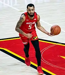 As a freshman, Ayala became a regular starter at Maryland, averaging 8.6 points, 2.9 rebounds and 2.1 assists per game.[4] In his sophomore season, he averaged 8.5 points, 2.9 rebounds and 2.5 assists per game, shooting 35.8 percent from the field.[5] In his junior season, he became his team's primary point guard with the departure of Anthony Cowan Jr.[6] Ayala averaged 15.1 points, 4.3 rebounds and 2.2 assists per game as a junior, earning All-Big Ten honorable mention. He declared for the 2021 NBA draft while maintaining his college eligibility, before ultimately returning.[7] Ayala was named Honorable Mention All-Big Ten by the media as a senior.[8]