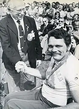 At the 1976 Toronto Games, he won three gold medals in the Men's Discus 3, Men's Pentathlon 3 and Men's Shot Put 3 events and a silver medal in the Men's Javelin 3 event;[7] he was also part of the Australia men's national wheelchair basketball team at the games.[8] Despite setting a world record in the discus, he rejected the gold medal for that event because of politics being injected into the Games; several national teams had boycotted the competition due to the presence of the South African Paralympic team during the apartheid era, at a time when many sports teams from that country were banned from international competition. Russell said: "We have enough of a common bond in our disabilities without governments bringing politics into it".[9][10] Following his protest, Russell was ordered to attend a meeting with Kevin Betts and Ludwig Guttmann where he left the meeting in frustration as a result of his issue with the politics associated with the Games. A press conference was then held the next morning where Russell was awarded a medal for the excellence of his protest which he later returned to the lawn bowler from whom it was taken.[4]