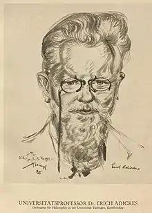 Adickes was born in Lesum (now part of Bremen), and died in Tübingen where he had been professor of philosophy since 1904. He studied theology, philosophy, and history at Tübingen, then at Berlin under Friedrich Paulsen (1846–1908), graduating Dr. Phil. with a dissertation titled Kants Systematik als systembildender Factor (Berlin: Mayer & Müller, 1887).[1] Habilitating at Kiel in 1895, he became a full professor there in 1898. In 1902 he moved to Münster as full professor, then in 1904 succeeded Christoph von Sigwart (1830–1904) at Tübingen.