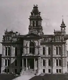 The courthouse of 1874 was designed in the Second Empire style. The facade rose three floors up with the roofline containing dormer windows. The corners of the structure as well as the center project from the rectangular footprint. The corners were capped with a mansard roof styled tower, and the center was capped by a pediment. The center of the building rose into a tall tower and is capped with a widow's walk.