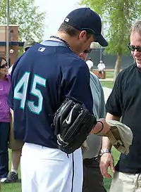 On February 8, 2008, Bédard was traded to the Seattle Mariners in a 5-for-1 deal sending outfielder Adam Jones and pitchers George Sherrill, Tony Butler, Chris Tillman and Kam Mickolio to the Orioles.[15] On February 13, Mariners manager John McLaren announced that he would be their Opening Day starter.[16] Bédard then signed a one-year, $7 million deal with the Mariners on February 15, avoiding salary arbitration.[17] He was 6–4 with a 3.67 ERA in 15 starts for the Mariners in 2008[5] but on July 10, 2008, he was placed on the 15-day disabled list with stiffness in his left shoulder.[18] He missed the rest of the season and underwent arthroscopic surgery on the shoulder on September 26.[6]