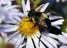 - Black with long yellow hairs, Scutellum wholly yellow, densely covered with yellow pile.