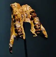 The holotype (specimen number MNHN PM69) is now in the Musée d'histoire naturelle - Guimet in Lyon and includes an upper jaw (with approaches of the zygomatic bone and two maxillary branches, each of the two posterior premolars (P3 and 4) and three molars (M1-3)). The piece is about 6 inches long, 5 inches wide and just over 3 inches high. In addition, the fossils include 15 more objects including the skull bones (frontal and nasal bones), lower jaw fragments and teeth and the upper and lower jaw.[1] It was about 20 cm tall at the shoulder and weighed about 5–6 kg.[2]