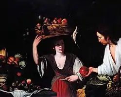 The relationship between the works of Stroiffi and Strozzi can be illustrated through the early work Fruit vendor (Ducal palace, Mantua). The work was only recently attributed to Stroiffi after having been attributed to a painter in the circle of Strozzi. The work was created in Mantua during the years of Stroiffi's apprenticeship. The painting is derived from Strozzi's original (Stanley Moss collection, Riverdale on Hudson, N.Y.). Stroiffi has reworked his master's model in line with his personal artistic preferences. The veil of the fruit vendor appears softened and the male profile reflects a model by Stroiffi, which reappears in a series of works recently attributed to the artist. Another difference between Stroiffi's and Strozzi's versions is that the fabrics in Strozzi's original are swollen and crispy while they are drooping and flat in Stroiffi's work. Stroiffi has also added more fruit and vegetables, showing his interest in the still life genre.[5]