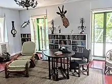 When Pauline had first seen 907 Whitehead Street during a house-scouting tour, she labeled it a "damned haunted house".[11] At the time, the house was in foreclosure and was in deep disrepair.[6] However, after recognizing its potential, she convinced her wealthy Uncle Gus to purchase it at $8,000 for her and Ernest as a wedding present.[12][13] Ernest appreciated the seclusion that the 1.5 acre lot would offer him while writing his works.[13] Employing out-of-work Conchs, the Hemingways restored the entire house.[14] Most of the house's inner furnishings were selected by Pauline, but Ernest insisted on the inclusion of his hunting trophies.[15] At the cost of air circulation, Pauline replaced the house's ceiling fans with chandeliers.[16] The couple also converted the second story of the carriage house into a writing studio for Ernest and transformed the basement into a wine cellar.[14]