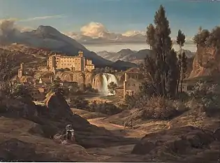 He continued travelling extensively, throughout the Rheinland and the Tyrol, then undergoing the classical Grand Tour to Italy. From 1823 to 1827, he lived in Rome, where he created some of his most accomplished works.[3] In Rome he came in contact to the Deutsch-Römer group of painters and met Josef Anton Koch and Friedrich Overbeck. In 1826 he started working with the French painter Camille Corot[4][5] and "re-discovered" with the German writer August Kopisch the Blue Grotto (Capri) near Naples, a tour which was described in Kopisch's book Entdeckung der blauen Grotte auf der Insel Capri (Discovery of the Blue Grotto on the Isle of Capri) in 1838.[6][7] Fries' numerous trips through the Roman Campagna and further regions of Italy are documented meticulously (with maps) by Sigrid Wechssler in her recent monography and catalogue raisonné.[8] Upon returning to Germany, he settled in Heidelberg, and married, in 1829, Louise Stockhausen (1804–1857) in Neckargemünd; the couple had four daughters.[9] 1830 Fries was in Munich, but relocated to Karlsruhe in 1831, when he received an appointment as grand-ducal court painter of Baden there. During his brief tenure, he painted a large number of vedute; both paintings and engravings.
