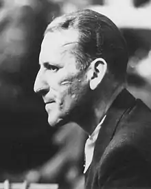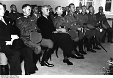 Historian Heinz Höhne counted Kaltenbrunner among fanatical Hitler loyalists and described him as being committed "to the bitter end."[35] Field reports from the SD in October 1944 about deteriorating morale in the military prompted Kaltenbrunner to urge the involvement of the RSHA in military court-martial proceedings, but this was rejected by Himmler who thought it unwise to interfere in Wehrmacht (military) affairs.[36] In December 1944, Kaltenbrunner was granted the additional rank of General of the Waffen-SS. On 15 November 1944 he was awarded the Knights Cross of the War Merit Cross with Swords. In addition, he was awarded the NSDAP Golden Party Badge and the Blutorden (Blood Order).[37] Using his authority as Chief of the RSHA, Kaltenbrunner issued a decree on 6 February 1945 that allowed policemen to shoot "disloyal" people at their discretion, without judicial review.[38]