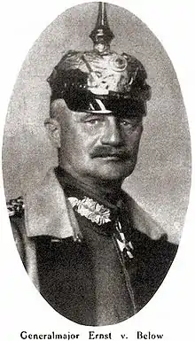 Ernst von Below was born on 17 April 1863 in Königsberg as the son of Prussian Generalmajor Ferdinand von Below. After being a cadet he joined the Prussian Army in 1881 as a Fähnrich, and a year later was commissioned a second lieutenant in the infantry. He entered the Prussian Staff College in 1890 and was promoted to premier lieutenant in the same year. In 1894, von Below was promoted to Hauptmann. In 1899 he was commandeered to the Infantry Training Battalion, attached to the 1st Foot Guard Regiment. Later he transferred to the 4th Guards Grenadiers as a company commander. From 1 April 1903 von Below served as an adjutant to Prince Joachim Albert of Prussia. On 6 May 1903 he was assigned as his personal adjutant and on 27 January 1904 he was promoted to major. Von Below left the staff on 13 September 1906, when he was appointed commander of the 2nd Battalion of the 91st Infantry Regiment. On 4 April 1908 he became commander of the 2nd Sea Battalion in Wilhelmshaven, and later would lead his unit in Tsingtao. He was promoted to lieutenant colonel on 20 March 1911. After his return to Germany, from 22 March 1912 von Below was in command of the 3rd Sea Battalion in Cuxhaven. On 27 January 1913 he transferred to the 1st Guard Grenadier Regiment. With his promotion to colonel on 1 October 1913, he was appointed commander of the 153rd Infantry Regiment in Altenburg. Six months later von Below moved to the Reichskolonialamt as nominal commander of the Schutztruppe.[1]