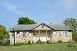 The Eros School Building is a historic school building in the small rural community of Eros, Arkansas, at the junction of Arkansas Highway 125 and Marion County Road 4018. It is a single-story Plain Tradition stone structure, with a Craftsman-style side-gable roof with exposed rafter tails. A gable-topped porch projects from the main (west-facing), supported by slender columns on a concrete base. The porch pediment, like those on the sides, is stuccoed. The school was built in 1935 as part of a Depression-era jobs program.[2]