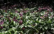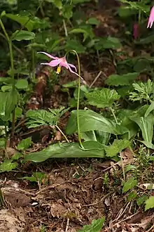 Erythronium revolutum is most abundant within 100 miles (161 km) of the coast, at altitudes of less than 1000 m.[3] The plant is found in moist places such as streambanks, bogs, and wet redwood and mixed evergreen forest understory.[2][3] It is slow-growing, taking 5–7 years to form a flowering size bulb,[4] and therefore is slow to establish in new locations.